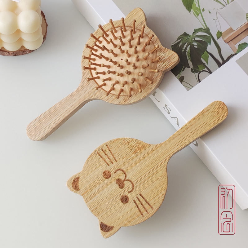 Cat Shape Natural Bamboo Wooden Hair Brush with Soft Scalp Massage Pins