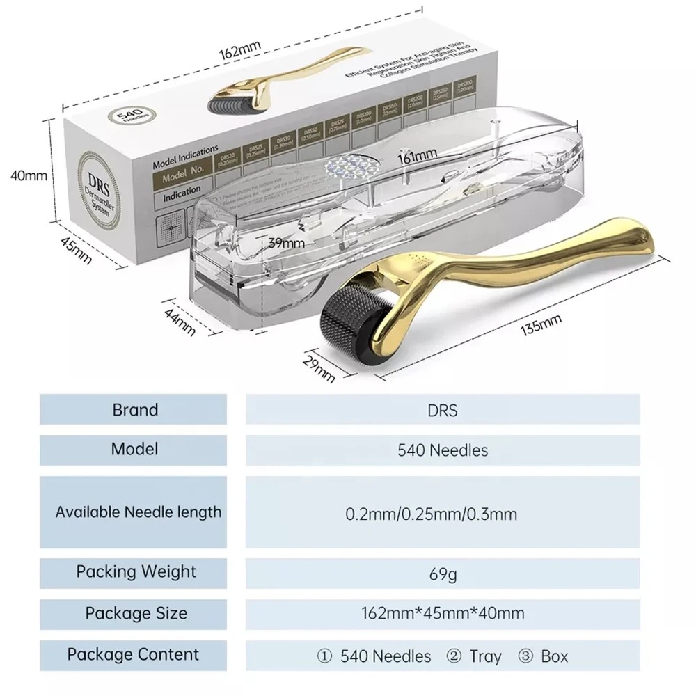 The Golden DRS Derma Roller (540 Titanium Needles) is a premium microneedling tool that helps reduce acne scars, wrinkles, and stretch marks while boosting collagen and hair growth. Its golden titanium design ensures safety, durability, and a luxurious skincare experience.