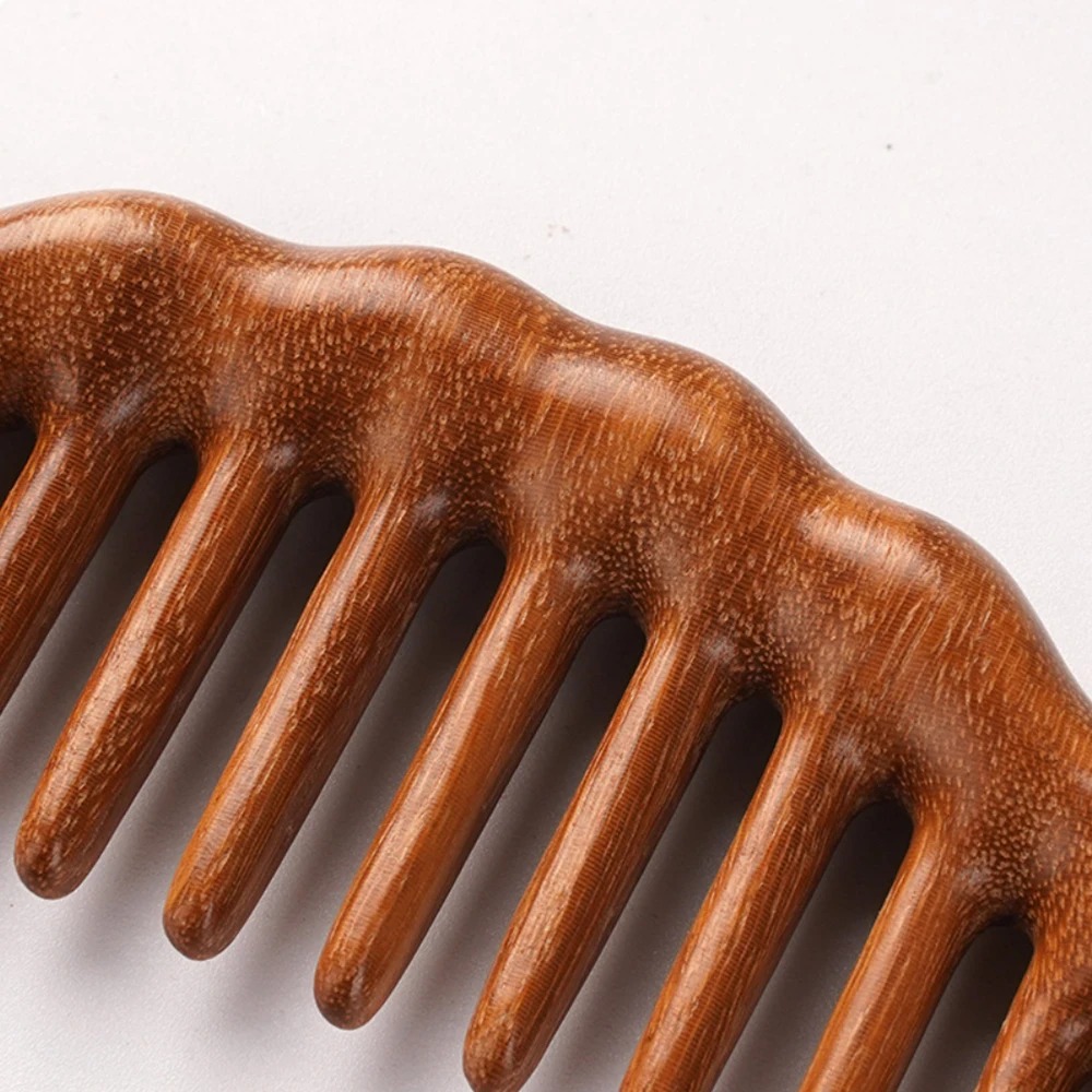This curved sandalwood wooden hair comb features wide, smooth teeth designed for easy detangling and gentle scalp massage. Made from natural wood, it helps reduce hair breakage, minimize static, and promote healthy scalp circulation.